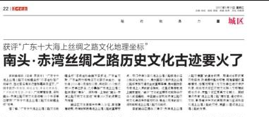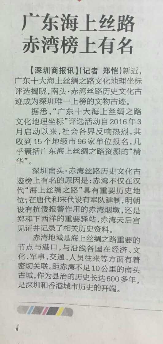 1月11日,赤湾入选“广东十大海上丝绸之路文化地理坐标”的消息被主流媒体集中报道,“南头·赤湾丝路历史文化古迹”作为深圳唯一上榜的文物古迹,成为深圳市又一文化名片。